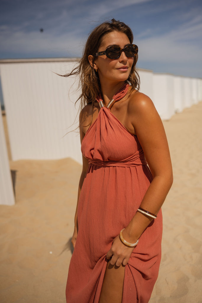 Vielseitige Eleganz: Perfekt als Abendkleid mit goldenen Heels oder als stilvolles Strandkleid – dieses Modell passt sich fließend vom entspannten Tag bis zum glamourösen Abend an.